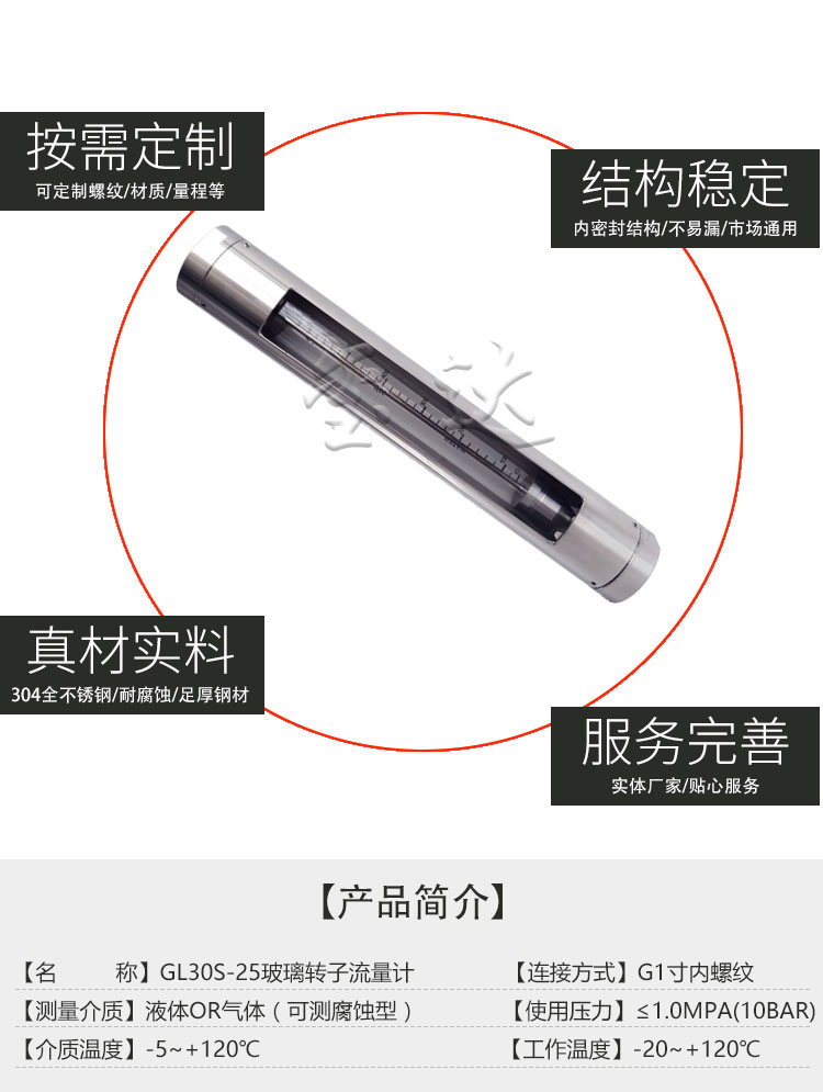 GL30S-25不銹鋼玻璃轉(zhuǎn)子流量計是一款采用直讀顯示,垂直螺紋連接,測量液體或者氣體的全不銹鋼玻璃轉(zhuǎn)子流量計。