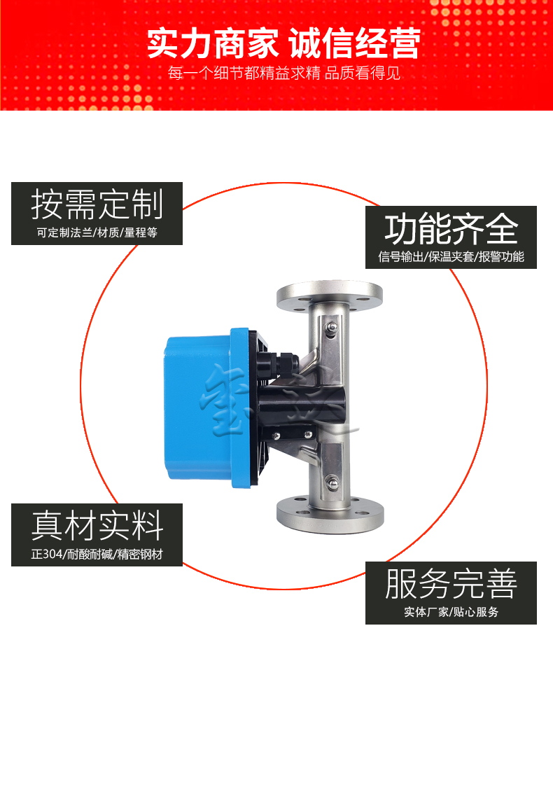 浮子內嵌一根磁鋼,指示器中有磁耦合系統與之形成磁關聯,當浮子在測量管中上下移動時,指示器中的磁耦合系統會帶動指針移動。利用磁傳感器檢測位移并轉換成電信號,經電路板處理后顯示瞬時和累計流量,指針在指示盤上指示瞬時流量。