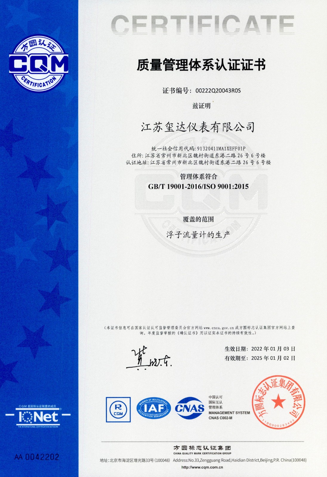 璽達儀表ISO9001:2015證書